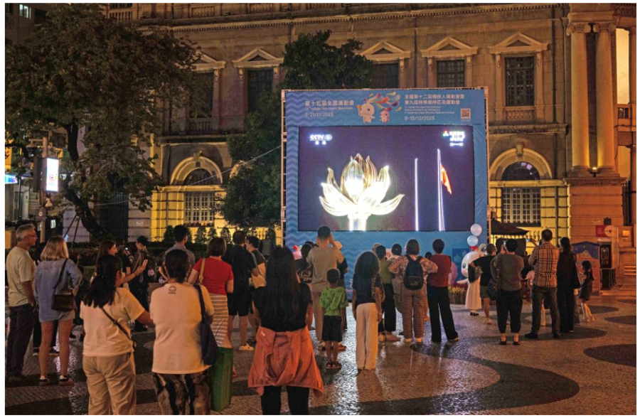 11月9日,第十五届全国运动会开幕式在广东奥林匹克体育中心举行,这是群众在澳门街头观看直播。新华社发(张金加 摄)