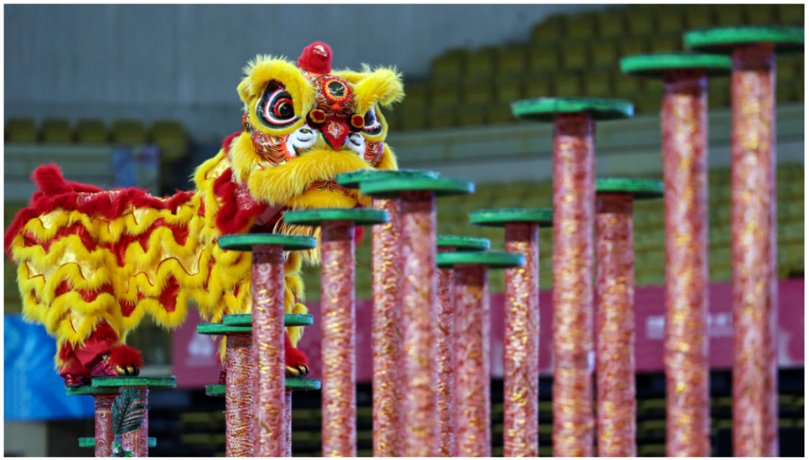 11月11日,粤港澳联队在第十五届全国运动会群众展演舞龙舞狮南狮自选项目决赛中获得一等奖。新华社记者 王鹏 摄