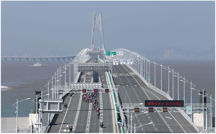 11月8日,第十五届全国运动会公路自行车男子个人赛参赛选手在港珠澳大桥上骑行。新华社记者 梁旭 摄