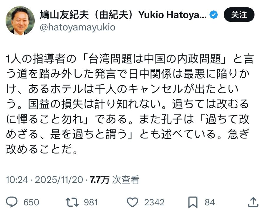 就近期日本首相高市早苗涉台错误言论,日本前首相鸠山由纪夫当地时间20日再次发文:“因为一名领导人发表了偏离‘台湾问题是中国内政’这一正道的言论,日中关系几乎陷入最恶劣的境地,据说有一家酒店出现一千人取消预订的情况。国家利益的损失无法估量。”