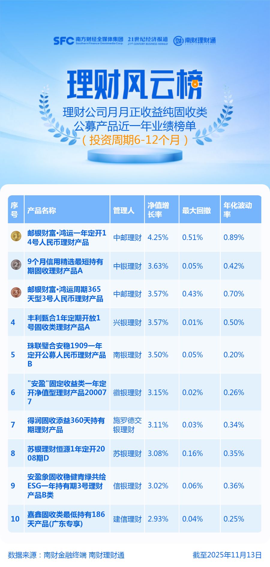 产品统计范围为理财公司发行的投资周期在6-12个月(含)的公募纯固收产品,且近6月每个完整的自然月月末均为正收益。产品统计截止日期为2025年11月13日,统计区间为近一年。
