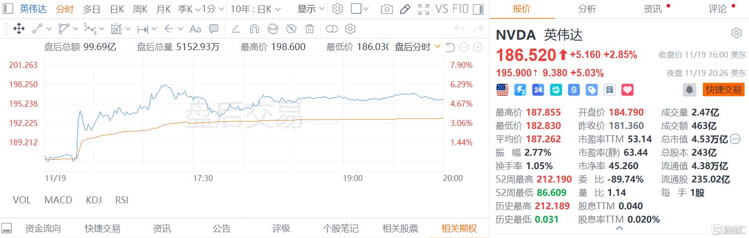受此影响,收涨近3%的英伟达在业绩公布后,盘后再涨超5%,报195.9美元。
