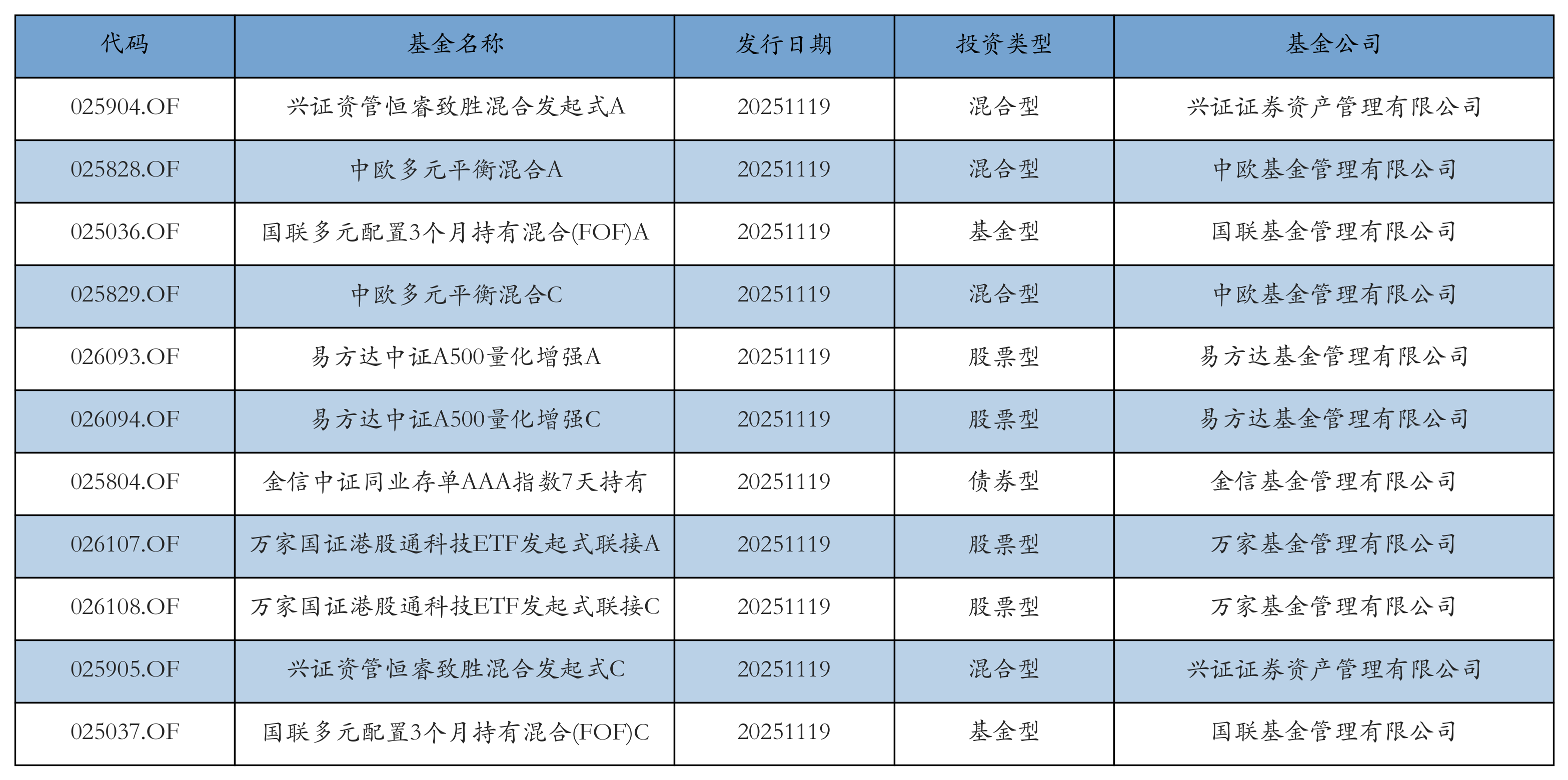 昨日有11只新基金发行,分别为:兴证资管恒睿致胜混合发起式A、中欧多元平衡混合A、国联多元配置3个月持有混合(FOF)A、中欧多元平衡混合C、易方达中证A500量化增强A、易方达中证A500量化增强C、金信中证同业存单AAA指数7天持有、万家国证港股通科技ETF发起式联接A、万家国证港股通科技ETF发起式联接C、兴证资管恒睿致胜混合发起式C、国联多元配置3个月持有混合(FOF)C,详情见下表: