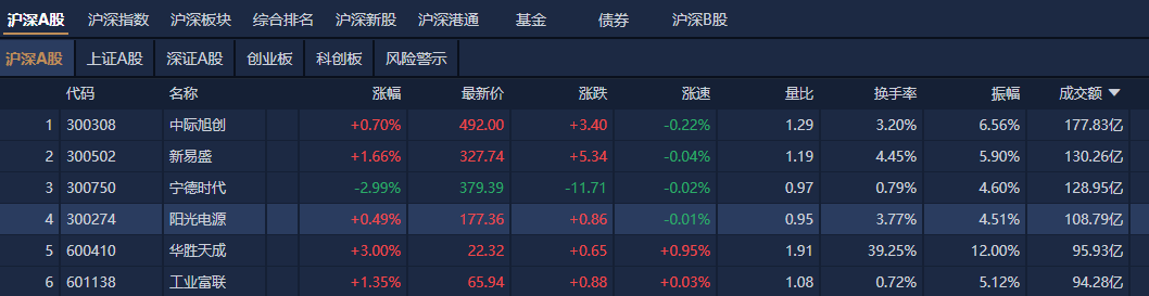 沪深两市成交额1.71万亿,较上一个交易日缩量177亿。个股上,中际旭创全天成交额超177亿元居首,新易盛、宁德时代、阳光电源的成交额均在100亿元以上。