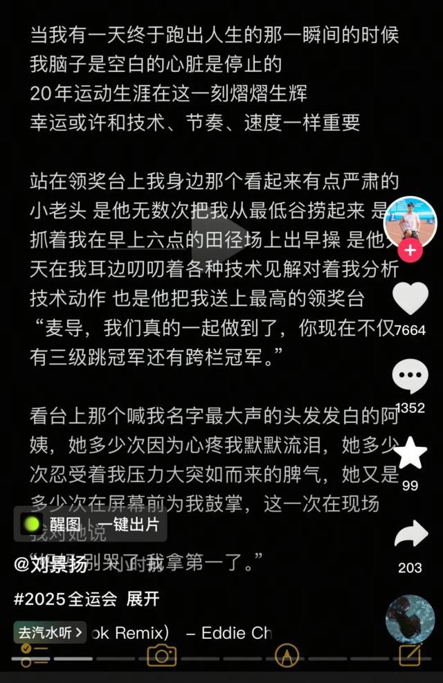 刘景扬在个人社交平台上发文表示:“站在领奖台上我身边那个看起来有点严肃的小老头,是他无数次把我从最低谷捞起来,也是他把我送上最高的领奖台。”