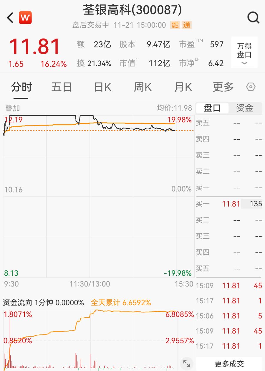 11月21日,荃银高科(300087.SZ)盘中触及涨停,截至收盘,股价报11.81元/股,涨16.24%,总市值为111.9亿元。