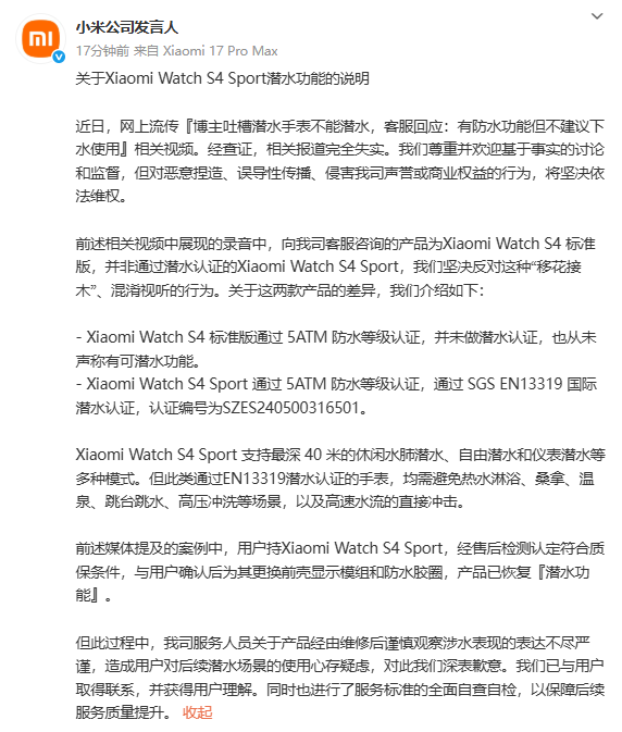 小米公司发言人微博今日发布关于Xiaomi Watch S4 Sport潜水功能的说明: