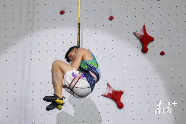 11月14日晚,十五运会攀岩男子速度决赛在广州大学城体育中心举行。上海队赵一程在夺冠后摆出“晚安”的庆祝动作。