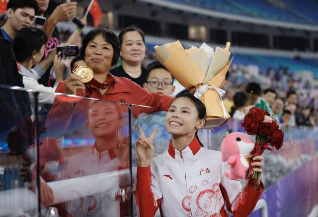 11月17日晚,十五运会田径女子400米栏决赛中,广东队莫家蝶以55.19秒的成绩摘金,赛后她将金牌献给了母亲。