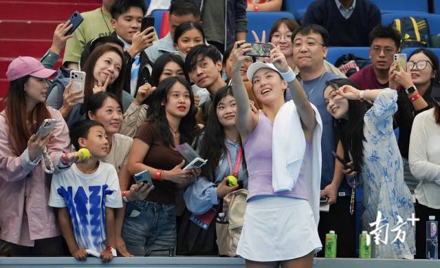11月14日,横琴国际网球中心,广东队高人气选手王欣瑜在比赛结束后和观众合影。