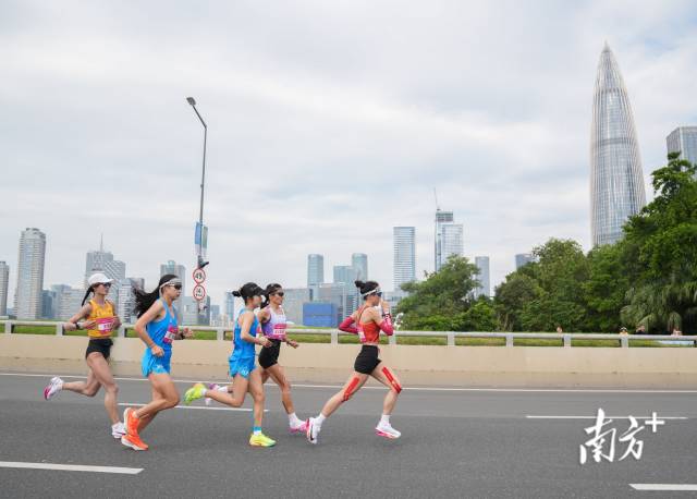 11月15日上午,十五运会田径(马拉松)比赛开赛。9时18分,领先的女子运动员从香港返回深圳,经过后海大桥,向终点稳步冲锋。