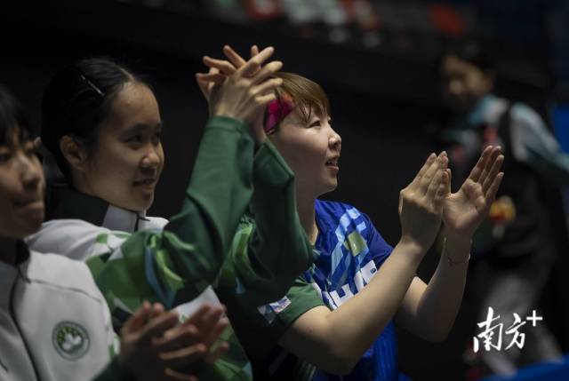 11月17日,乒乓球女子团体小组赛中,澳门队老将朱雨玲为年轻队员鼓掌助威。
