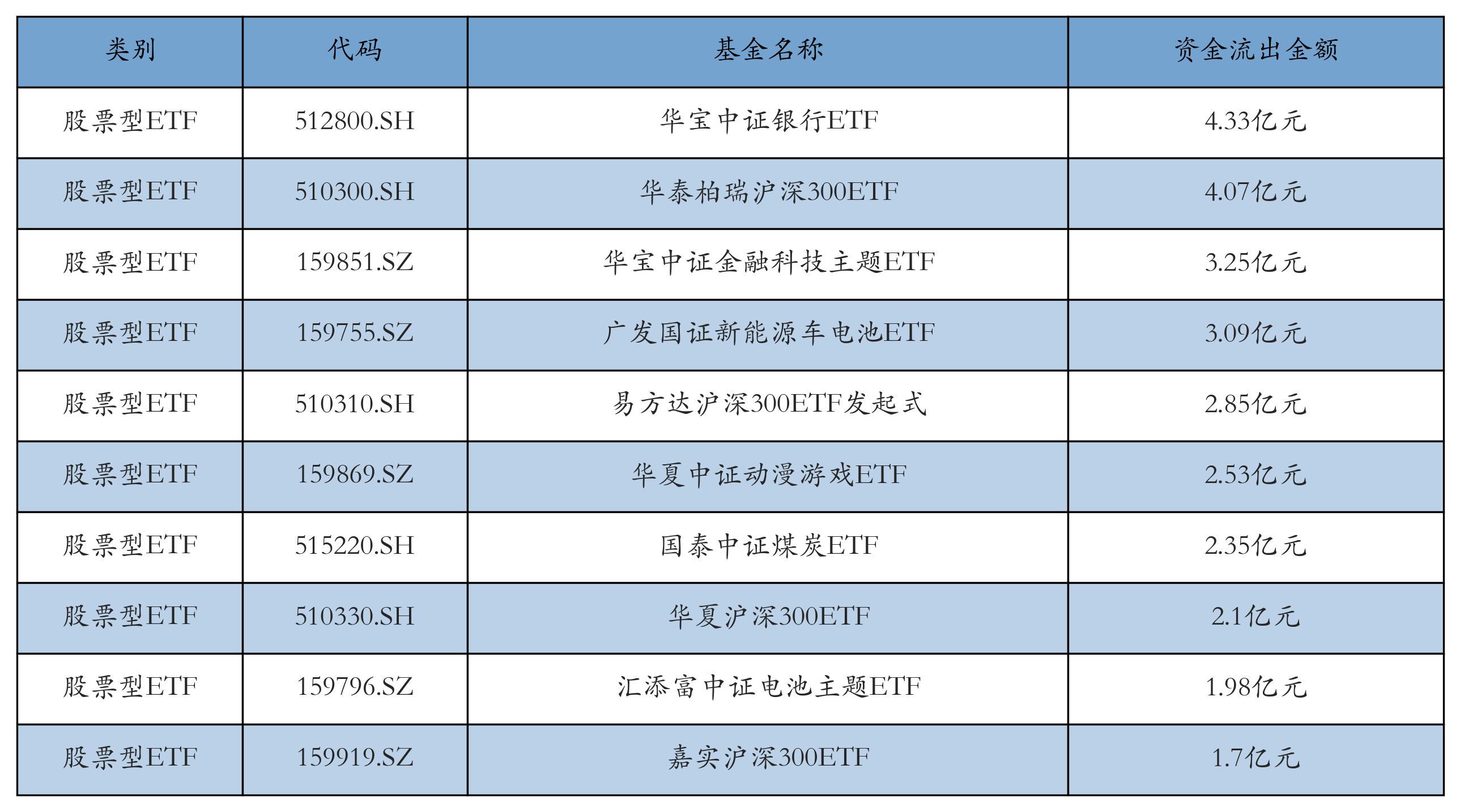 昨日股票型ETF资金流出最多的3只ETF及其流出金额分别为:华宝中证银行ETF(流出4.33亿元)、华泰柏瑞沪深300ETF(流出4.07亿元)、华宝中证金融科技主题ETF(流出3.25亿元)。资金流出前10详情见下表: