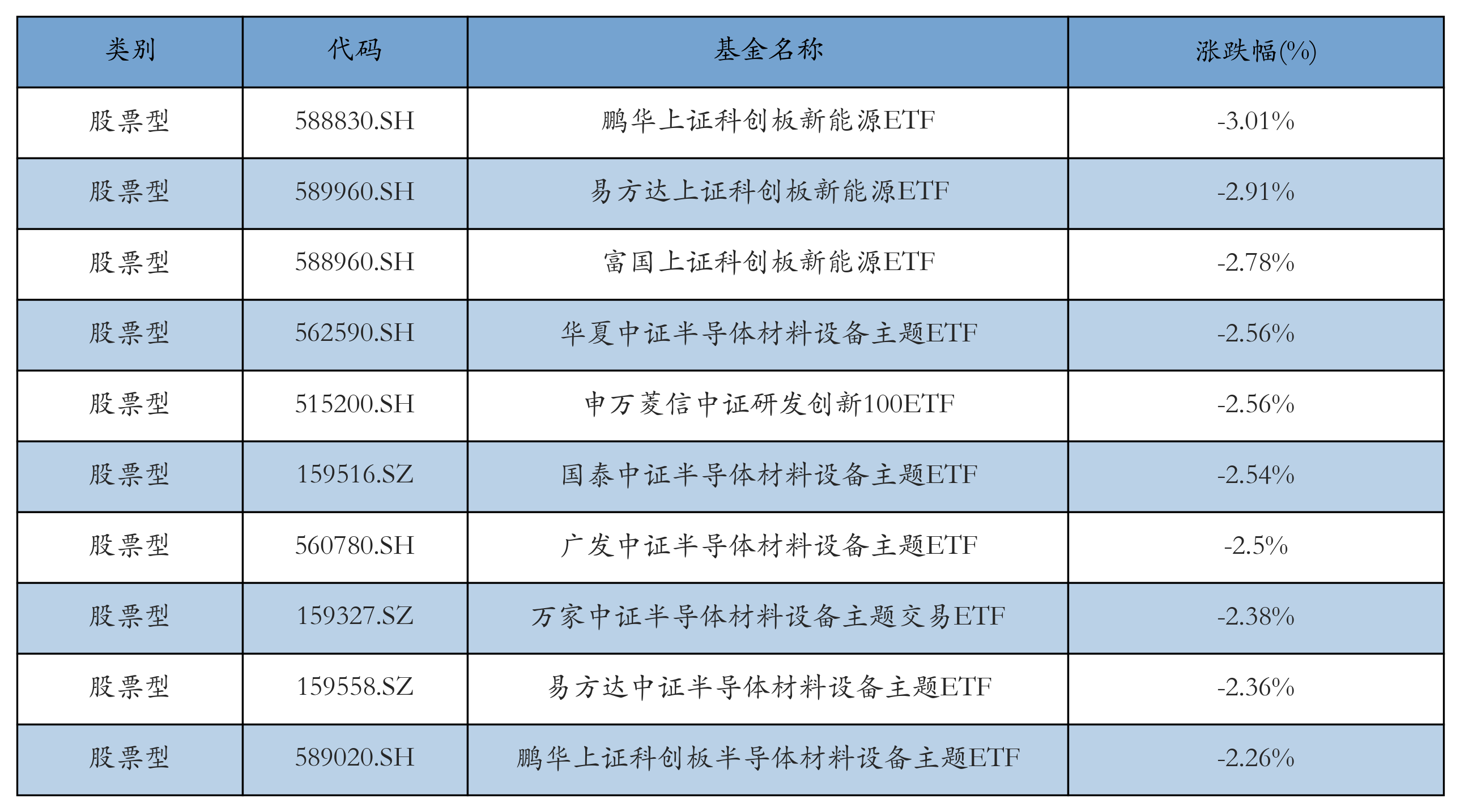 昨日股票型ETF跌幅最大的3只ETF及其收益率分别为:鹏华上证科创板新能源ETF(-3.01%)、易方达上证科创板新能源ETF(-2.91%)、富国上证科创板新能源ETF(-2.78%)。跌幅前10详情见下表: