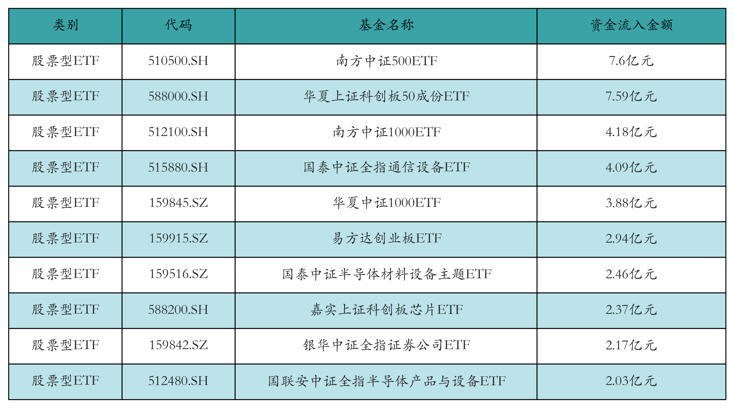 昨日股票型ETF资金流入最多的3只ETF及其流入金额分别为:南方中证500ETF(流入7.6亿元)、华夏上证科创板50成份ETF(流入7.59亿元)、南方中证1000ETF(流入4.18亿元)。资金流入前10详情见下表: