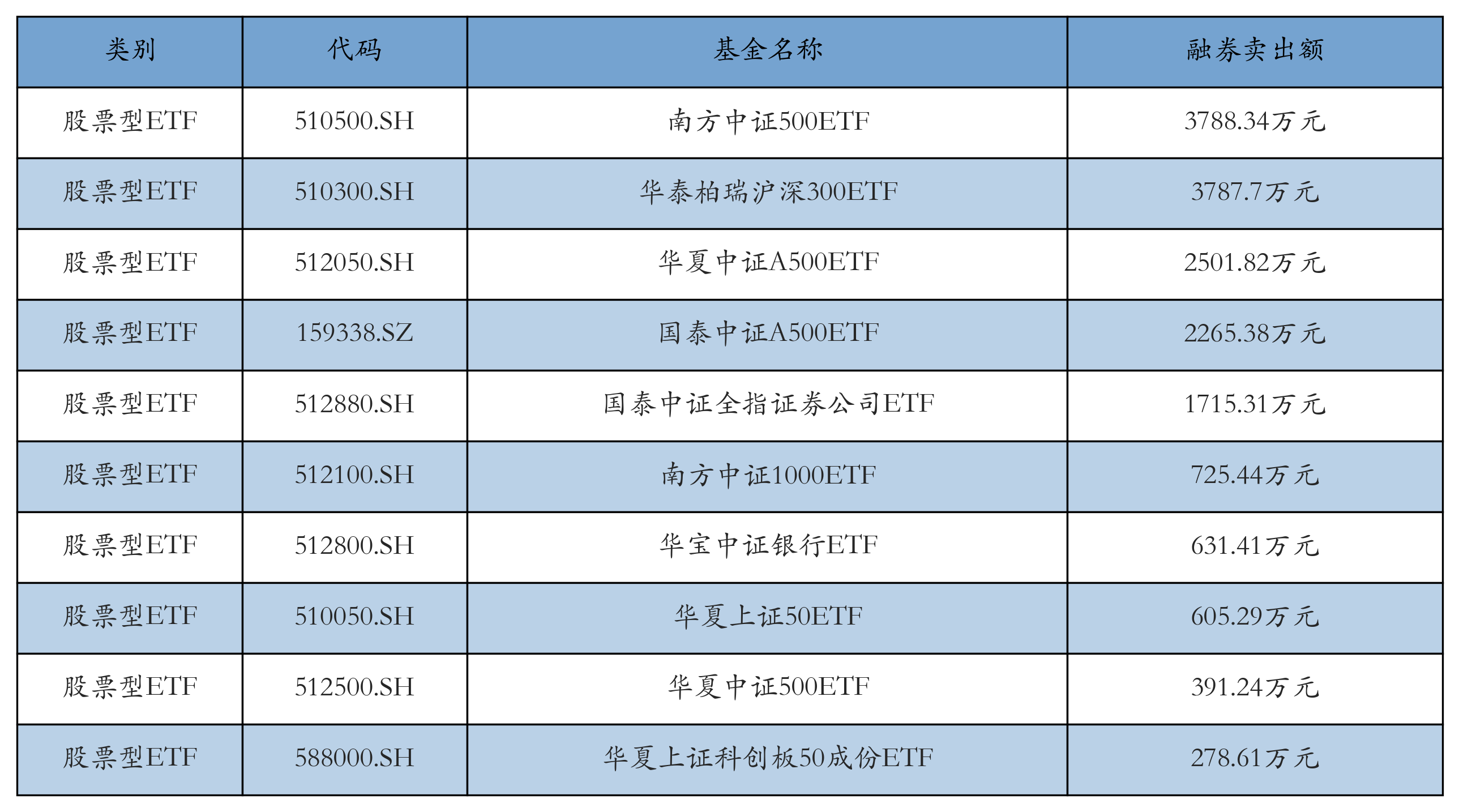 昨日股票型ETF融资卖出额最高的3只ETF及其卖出金额分别为:南方中证500ETF(3788.34万元)、华泰柏瑞沪深300ETF(3787.7万元)、华夏中证A500ETF(2501.82万元)。融券卖出额前10详情见下表: