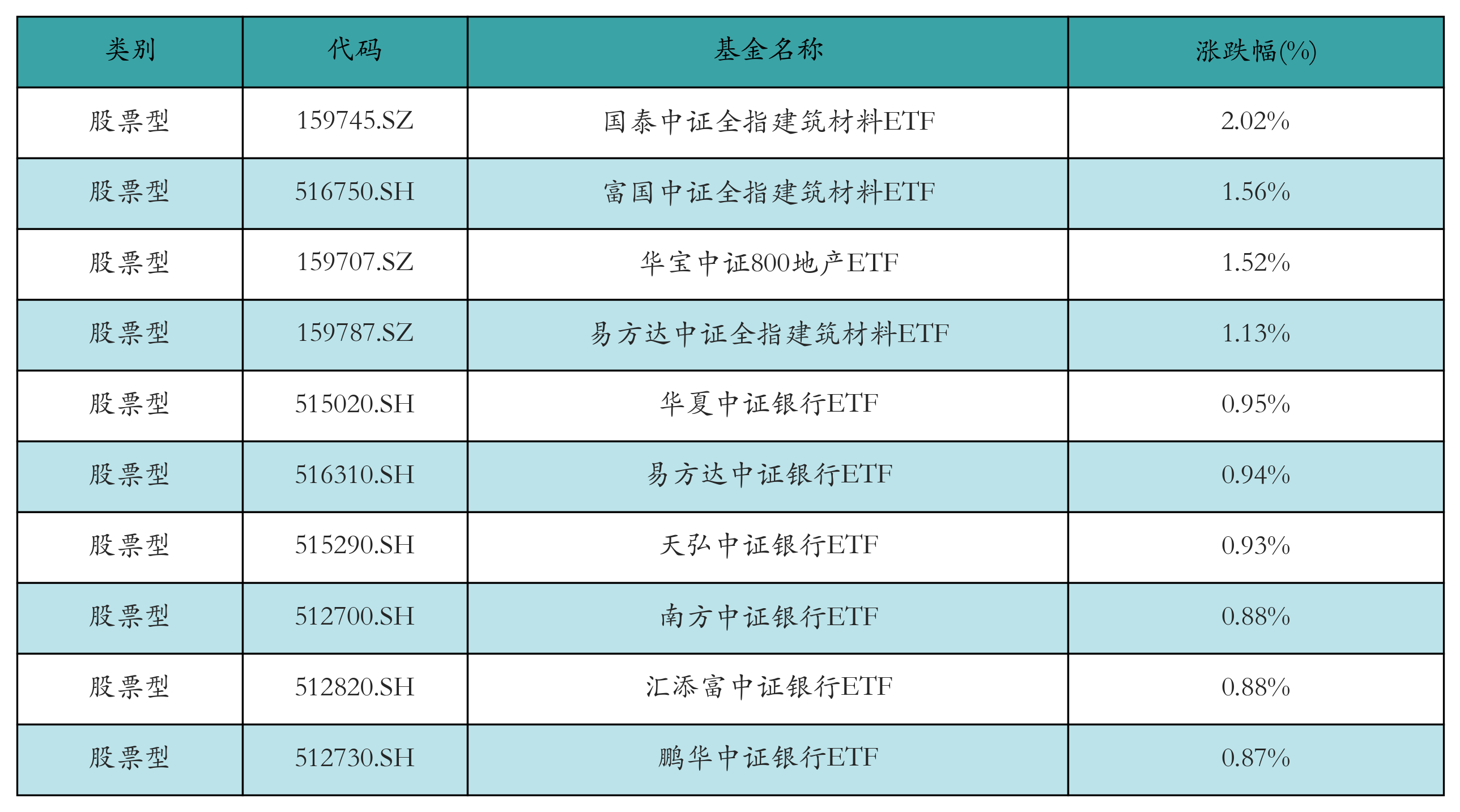 昨日股票型ETF涨幅最高的3只ETF及其收益率分别为:国泰中证全指建筑材料ETF(2.02%)、富国中证全指建筑材料ETF(1.56%)、华宝中证800地产ETF(1.52%)。涨幅前10详情见下表: