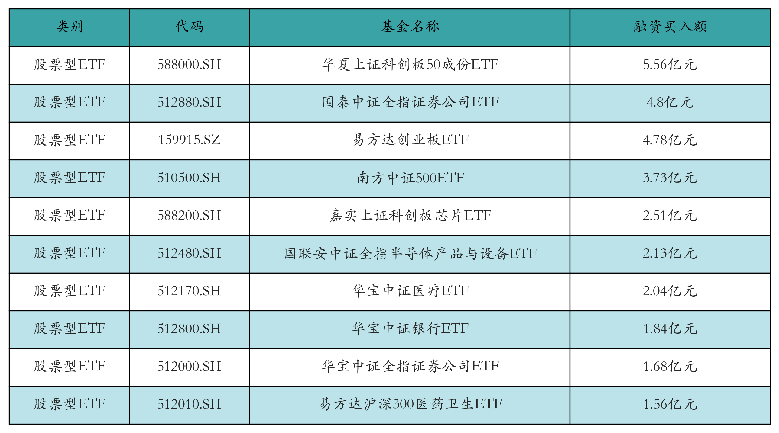 昨日股票型ETF融资买入额最高的3只ETF及其买入金额分别为:华夏上证科创板50成份ETF(5.56亿元)、国泰中证全指证券公司ETF(4.8亿元)、易方达创业板ETF(4.78亿元)。融资买入额前10详情见下表: