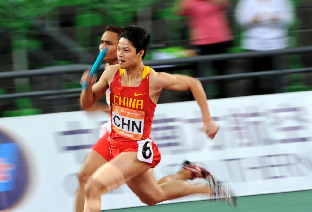 2010年11月26日,中国队选手苏炳添(右)在广州奥体中心体育场进行的第16届亚运会田径男子4X100米接力决赛中。新华社记者 李钢 摄