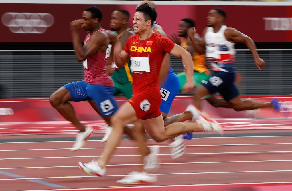 2021年8月1日,在东京奥运会田径男子100米半决赛中,苏炳添跑出了9秒83的成绩,打破亚洲纪录。新华社记者 王丽莉 摄