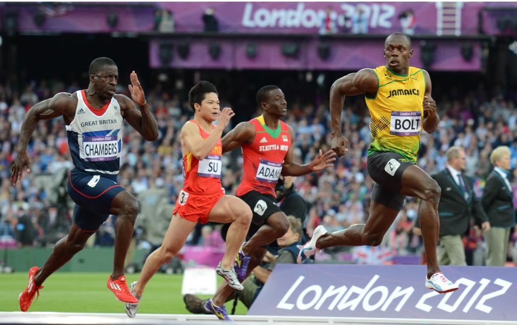 2012年8月5日,苏炳添(左二)在2012年伦敦奥运会男子100米半决赛比赛中。新华社记者 杨磊 摄