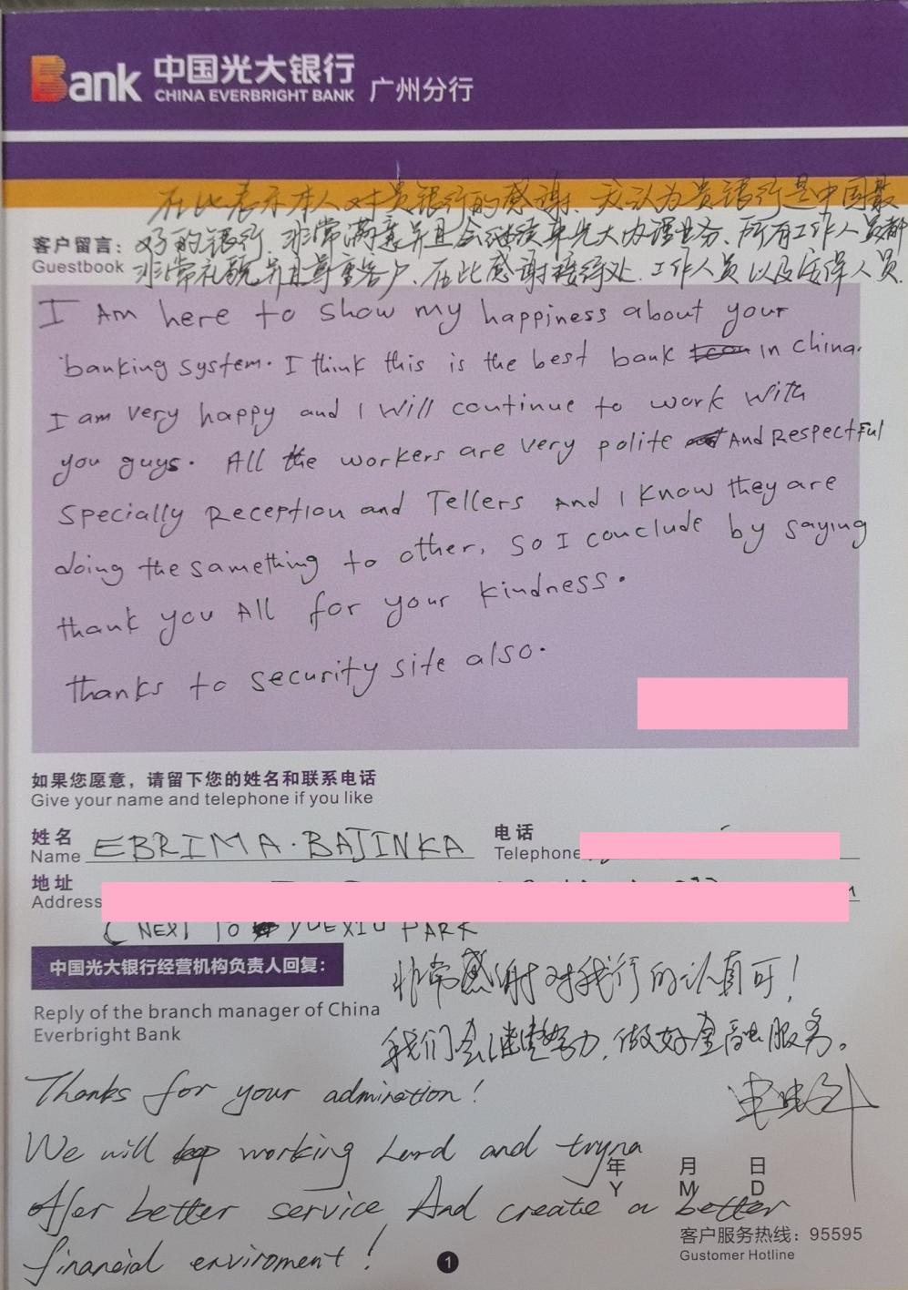 针对外籍客户可能遇到的特殊需求,他们提供了专业的指导与协助,有效解决了客户在异国他乡办理金融业务可能面临的困难。在整个服务过程中,工作人员始终面带微笑,态度亲切友好,营造了温馨、舒适的服务氛围,让客户感受到了充分的尊重与关怀。业务办理完毕后,该外籍客户被全运会赛事所吸引,工作人员与其详细交流。最后,对工作人员的专业能力、服务态度及整体的服务体验给予极高评价,同时在“客户留言簿”上亲笔写下表扬信。
