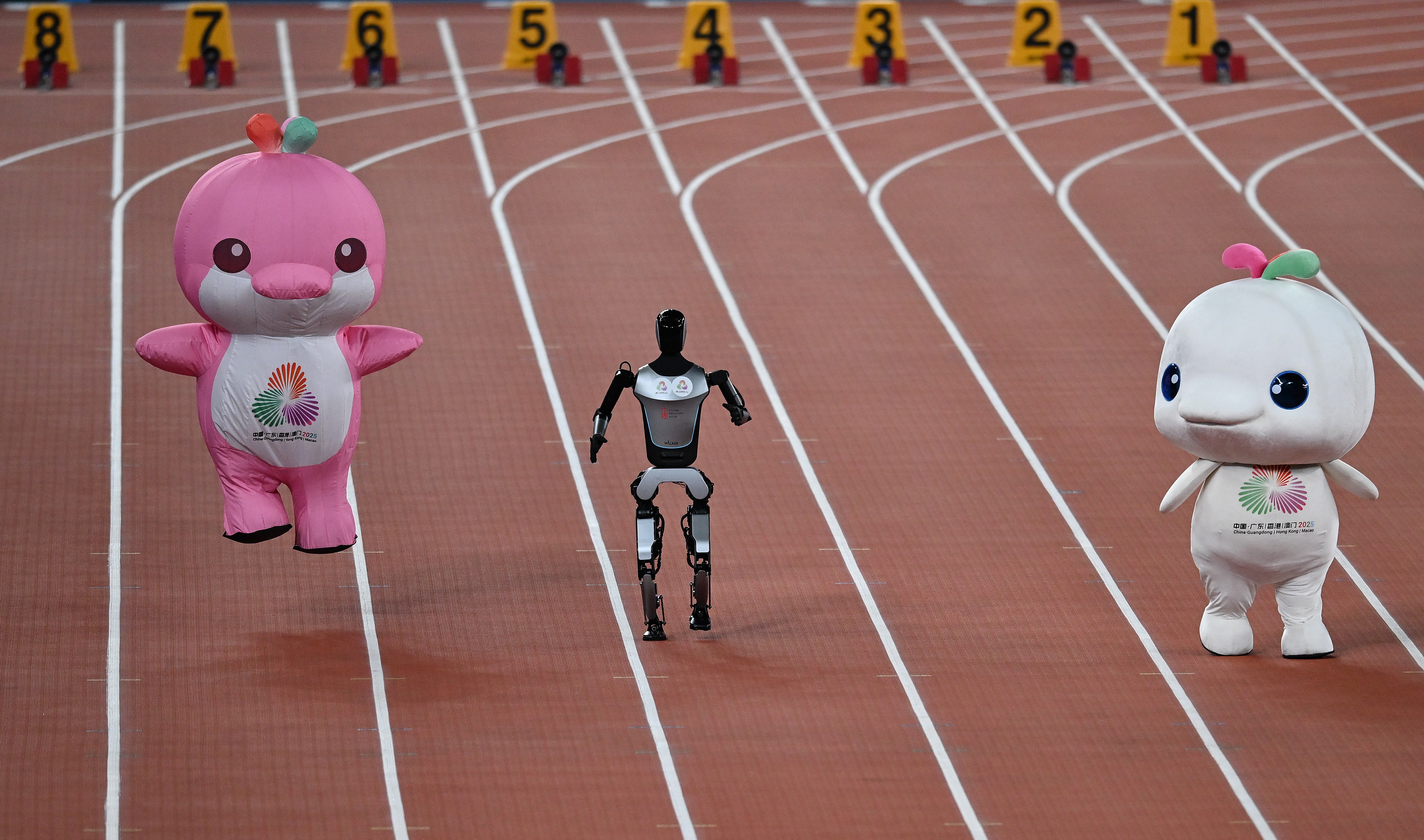 ↑11月17日,在田径项目赛事开始前的暖场活动中,机器人和吉祥物喜洋洋、乐融融在广东奥体中心体育场赛跑。新华社记者 周牧 摄
