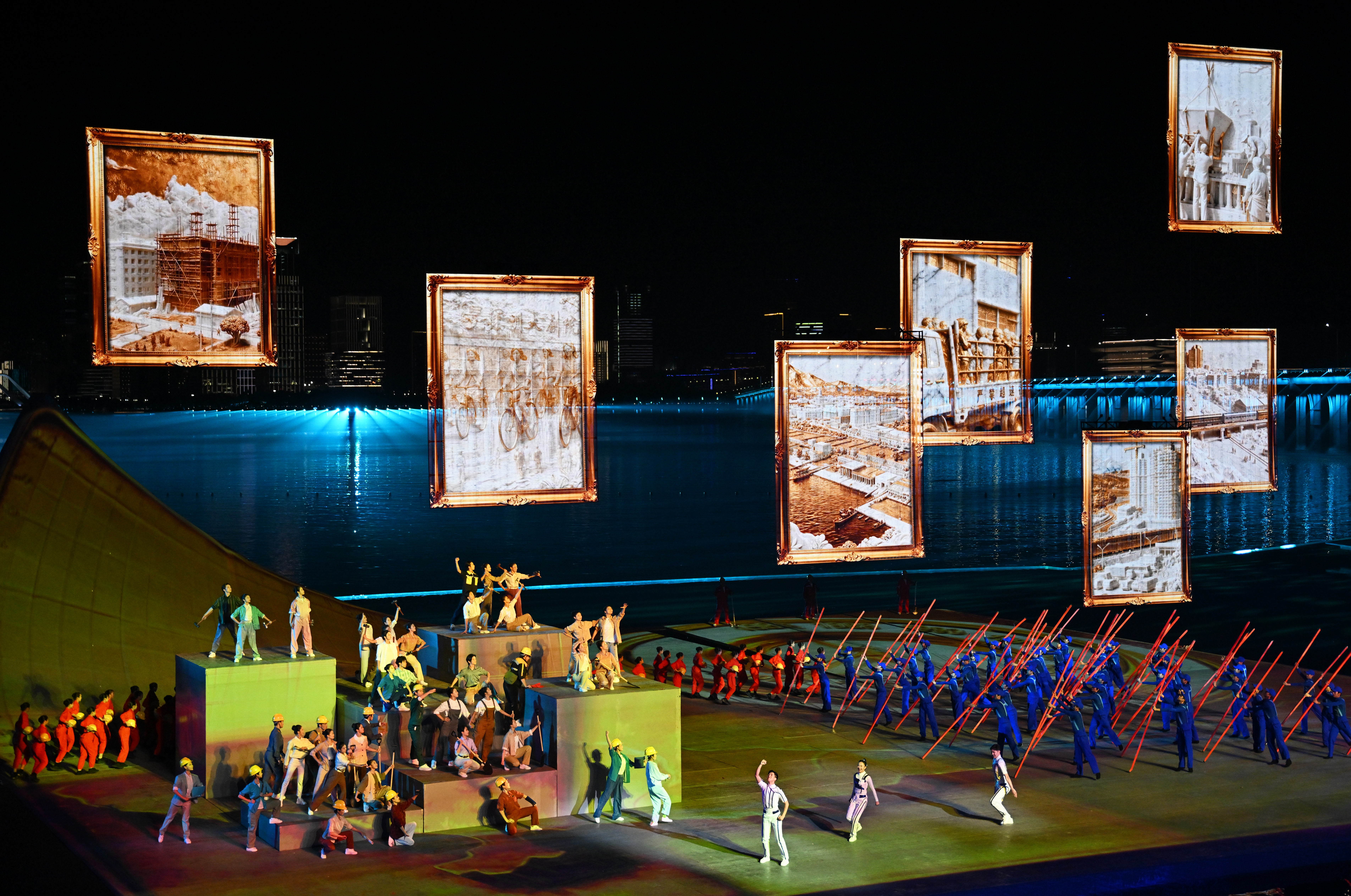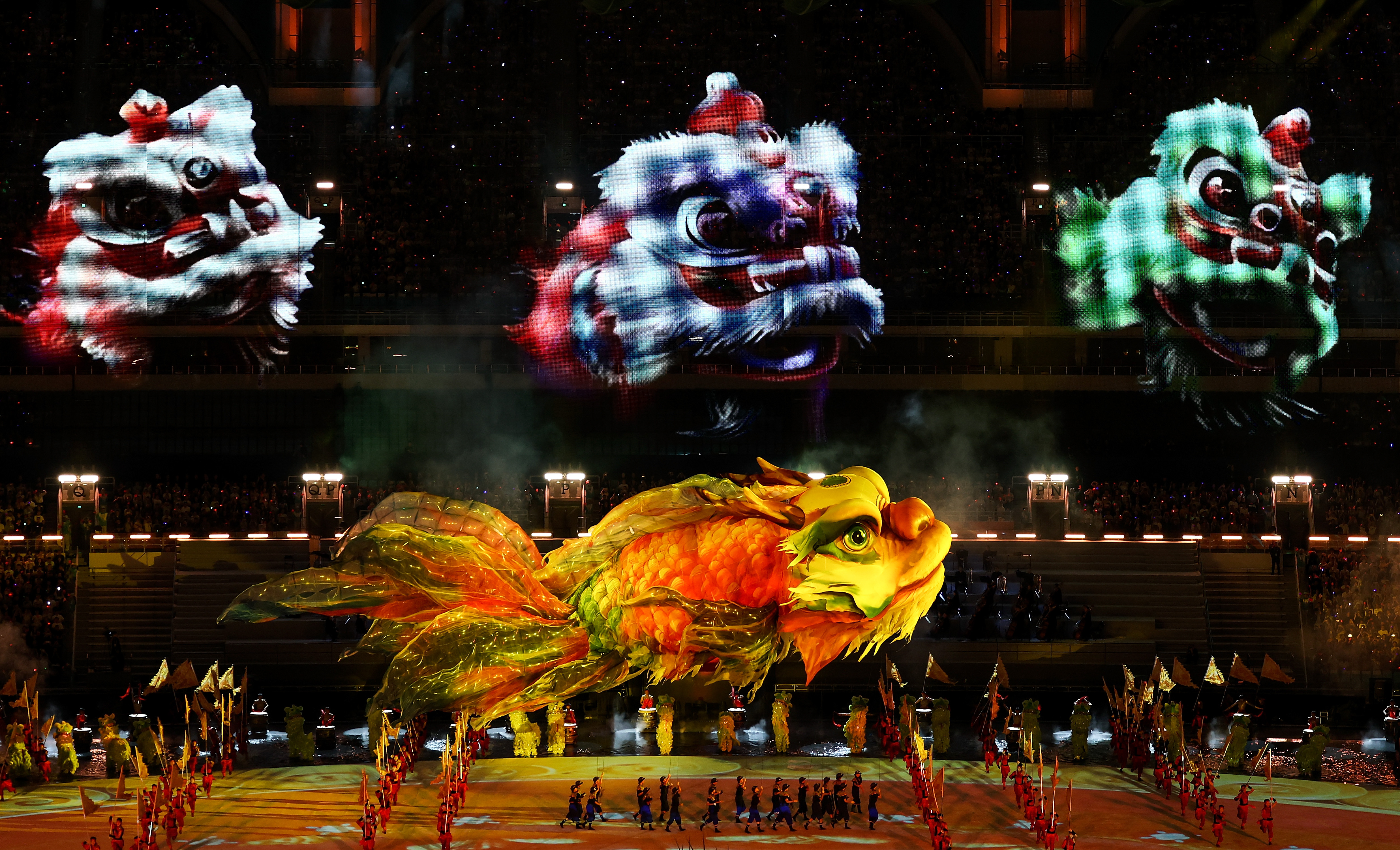 ↑11月9日,在第十五届全国运动会开幕式上,巨型鳌鱼“游入”体育场上空。新华社记者 卢汉欣 摄