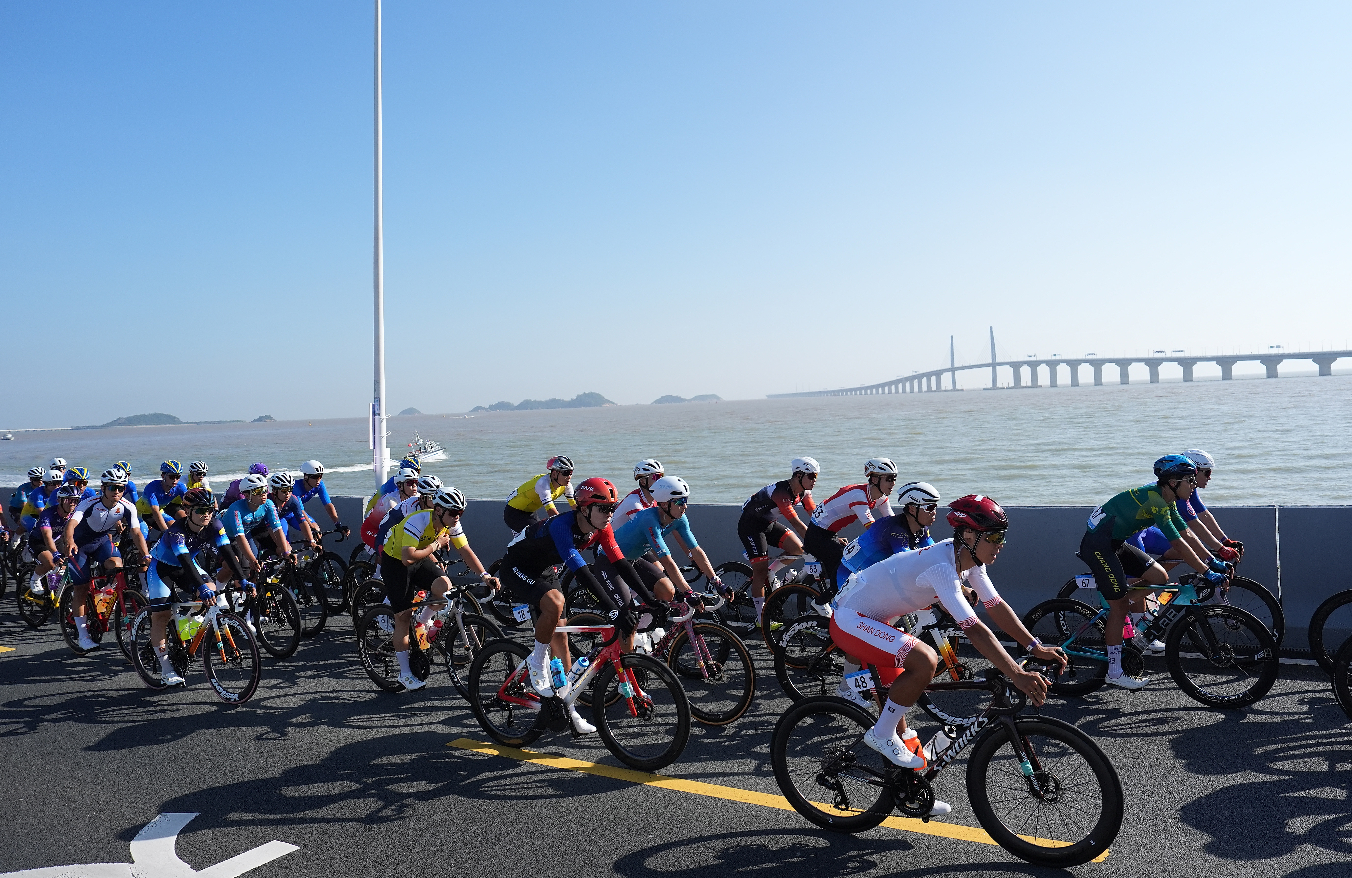 ↑11月8日,第十五届全国运动会公路自行车男子个人赛决赛开赛,全程231.8公里,选手将经过港珠澳大桥,跨越粤港澳三地。新华社记者 颜麟蕴 摄