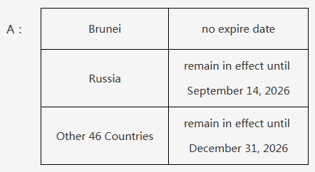 目前,中方对文莱持普通护照人员的免签政策未设施行期限,对俄罗斯持普通护照人员的免签政策施行至2026年9月14日,对其余46国持普通护照人员的免签政策施行至2026年12月31日。
