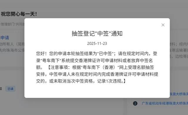11月23日,“粤车南下”信息管理服务系统正式公布“粤车南下”进入香港市区的抽签结果。此次共有2388人参与抽签,1700人中签。
