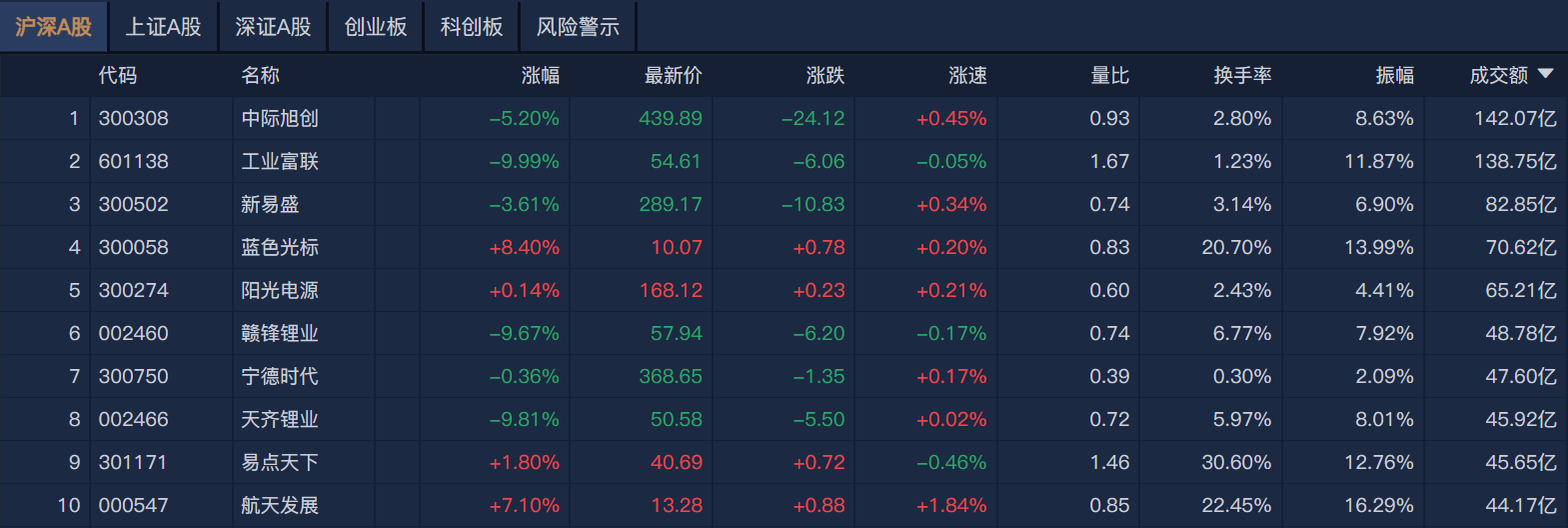 南财金融终端显示,个股方面,中际旭创半日成交额超142亿元居首,工业富联、新易盛、蓝色光标成交额靠前。