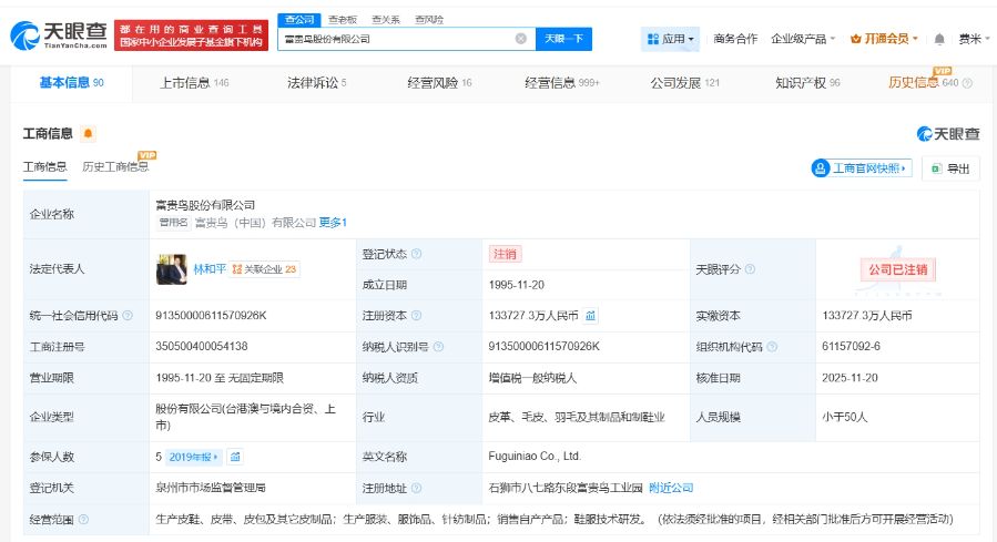 11月24日,21财经·南财快讯记者注意到,天眼查工商信息显示,富贵鸟股份有限公司登记状态由存续变更为注销,注销原因为宣告破产。