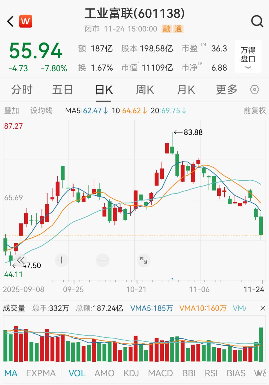 近日,21财经《辟谣财知道》注意到,有市场传闻工业富联有关订单或展望下调。或受相关消息影响,11月24日,工业富联盘中跌停,截至收盘,报55.94元/股,跌7.8%,总市值为1.11万亿元,成交额居A股第二名,为187.2亿元。近两个交易日,工业富联累计跌幅超15%,股价创下近2个月以来新低。