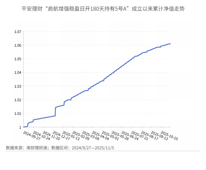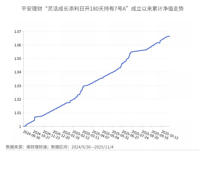“灵活成长添利日开180天持有7号A”是平安理财在2024年9月底发行的一款中低风险等级固收类产品。该产品紧扣“绝对收益”目标,以中短久期债券为基础仓位,密切关注债券市场和货币市场运行状况与风险收益特征,将不低于80%的资金投资于固定收益类资产,将不低于5%资金投资于现金或到期日在一年以内的国债、中央银行票据和政策性金融债券,业绩比较基准为2.00%—2.80%。
