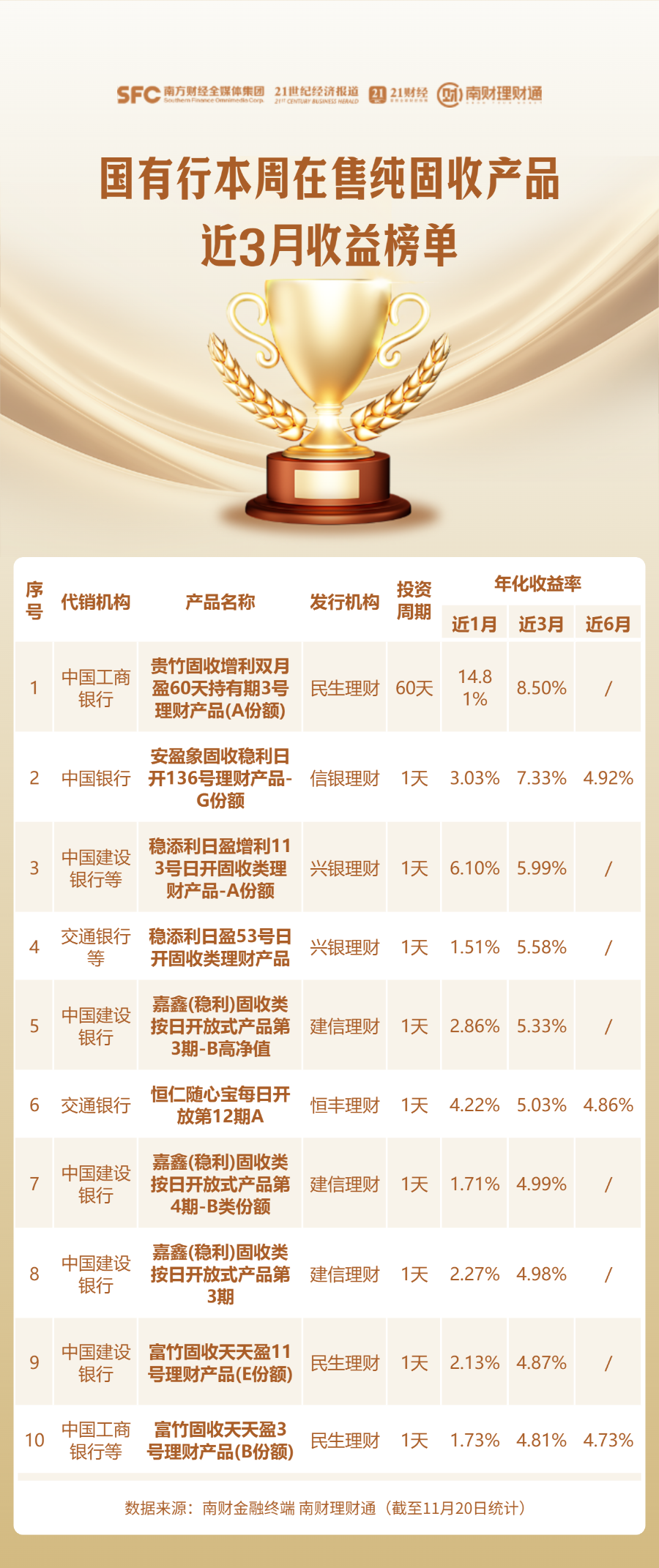 编者按:当前银行理财货架产品琳琅满目,诸如“增强”“稳健”“均衡”等名称相近、特征模糊的产品层出不穷,投资者应如何甄别与选择?为降低投资者的选择成本,南财理财通课题组从代销机构角度入手,每周一聚焦各渠道当周在售的理财产品,搜罗其中业绩表现优异者,并发布代销产品业绩榜单。
