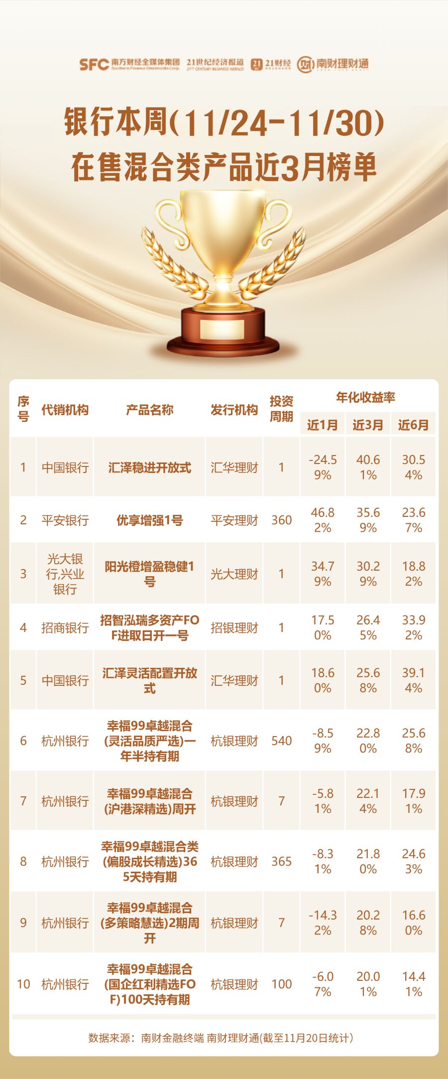 编者按:当前银行理财货架产品琳琅满目,诸如“增强”“稳健”“均衡”等名称相近、特征模糊的产品层出不穷,投资者应如何甄别与选择?为降低投资者的选择成本,南财理财通课题组从代销机构角度入手,聚焦各渠道当周在售的理财产品,搜罗其中业绩表现优异者,并发布代销产品业绩榜单。