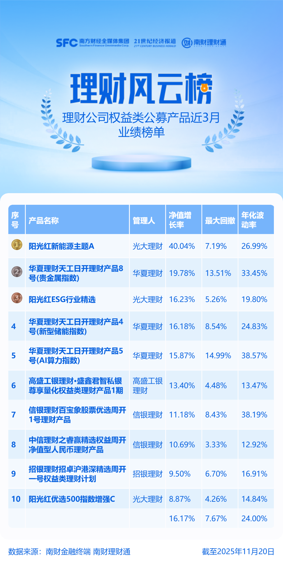 产品统计范围为理财公司权益类理财公募产品,统计截止日期为2025年11月20日,统计区间为近3个月。
