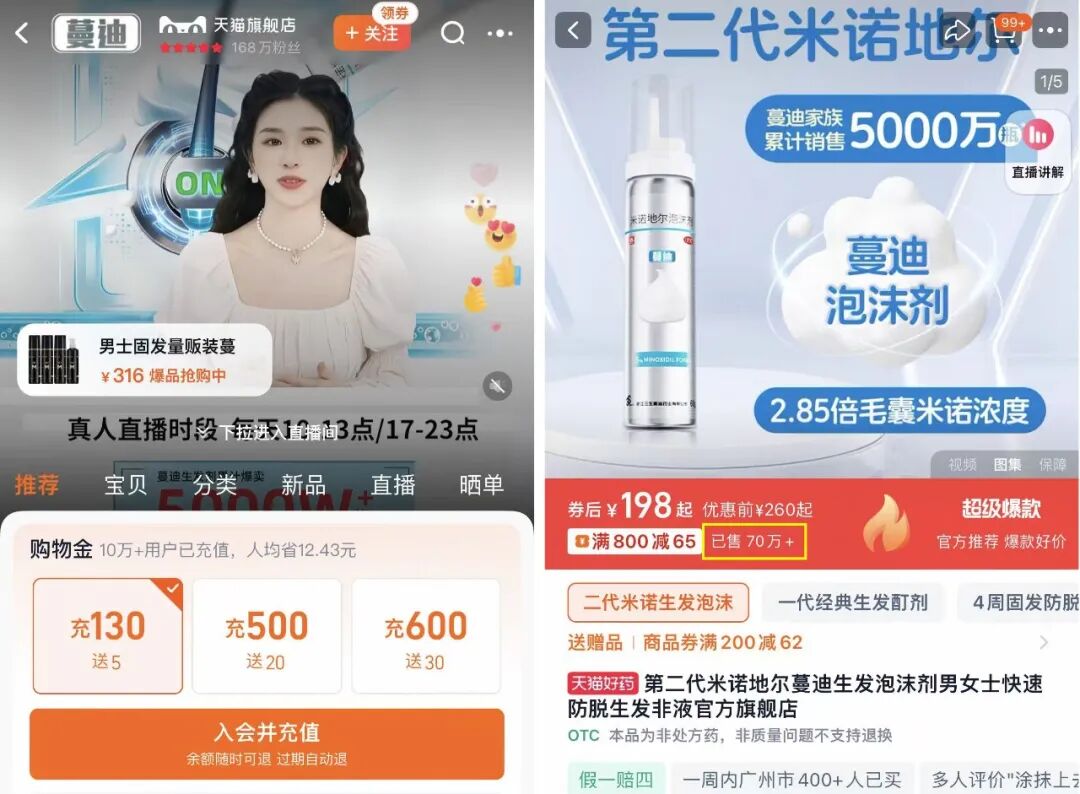 《21CBR》记者查询天猫蔓迪旗舰店,泡沫剂产品售价198元/瓶,显示已售70万+,位列天猫生发液热销榜第一。