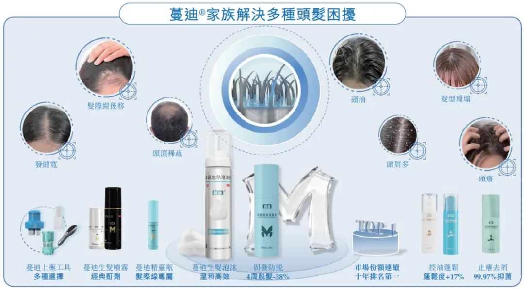 据灼识咨询,在中国脱发药物赛道,蔓迪系列米诺地尔类脱发治疗产品的零售额,已连续10年排名第一,市场份额达57%。
