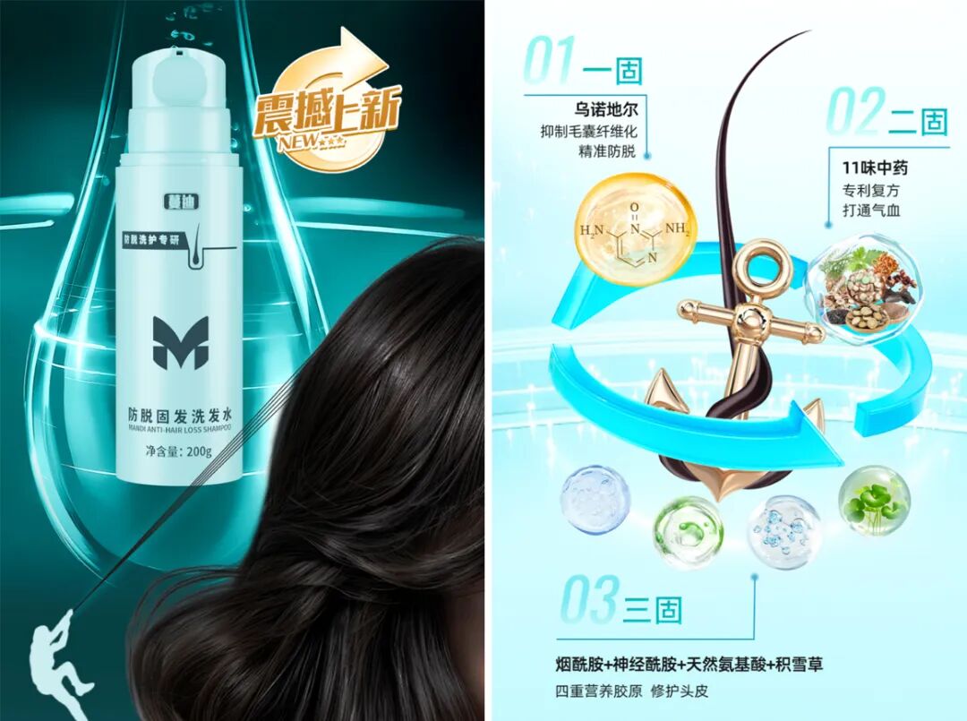 3月,蔓迪推出的防脱发洗发水,号称中国首款添加乌诺地尔防脱发成份的功效防脱发洗发产品。