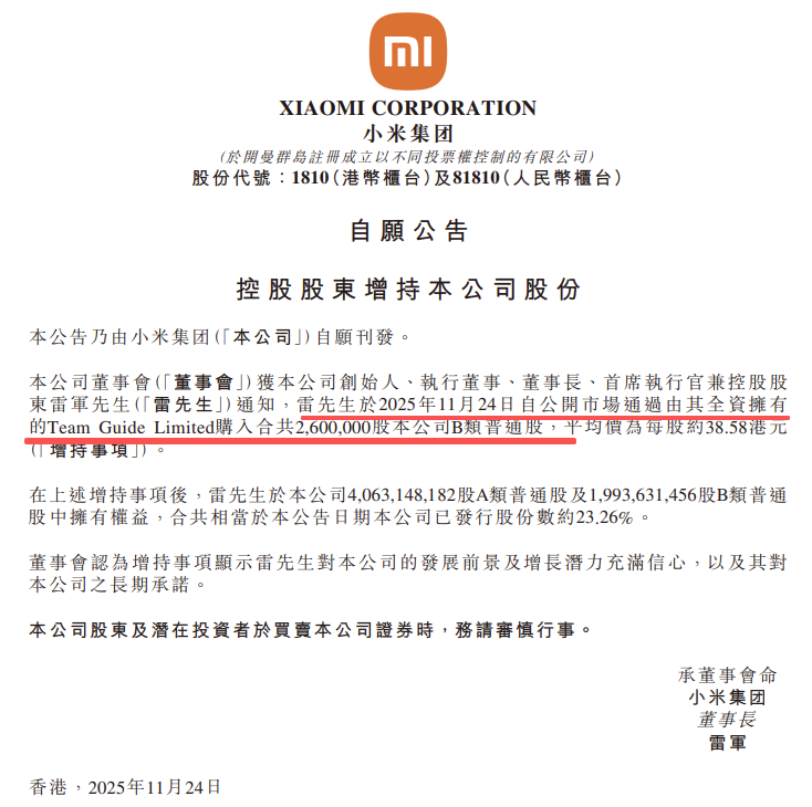 小米集团于港交所发布公告表示,小米集团创始人、董事长兼CEO雷军个人斥资超1亿港元增持小米集团260万股,平均价为每股约38.58港元,雷军持股比例增加至23.26%。本月,小米集团已分别于20日和21日连续两日回购公司股票2150万股,总斥资金额超8亿港币。