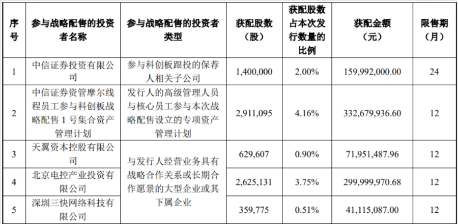 摩尔线程发布首次公开发行股票并在科创板上市网下初步配售结果及网上中签结果公告,本次发行战略配售的缴款及配售工作已结束,本次发行的参与战略配售的投资者均按承诺参与了本次发行的战略配售。经确认,《发行公告》中披露参与战略配售的投资者参与本次发行的战略配售有效。本次发行最终战略配售结果如下。中签结果如下: