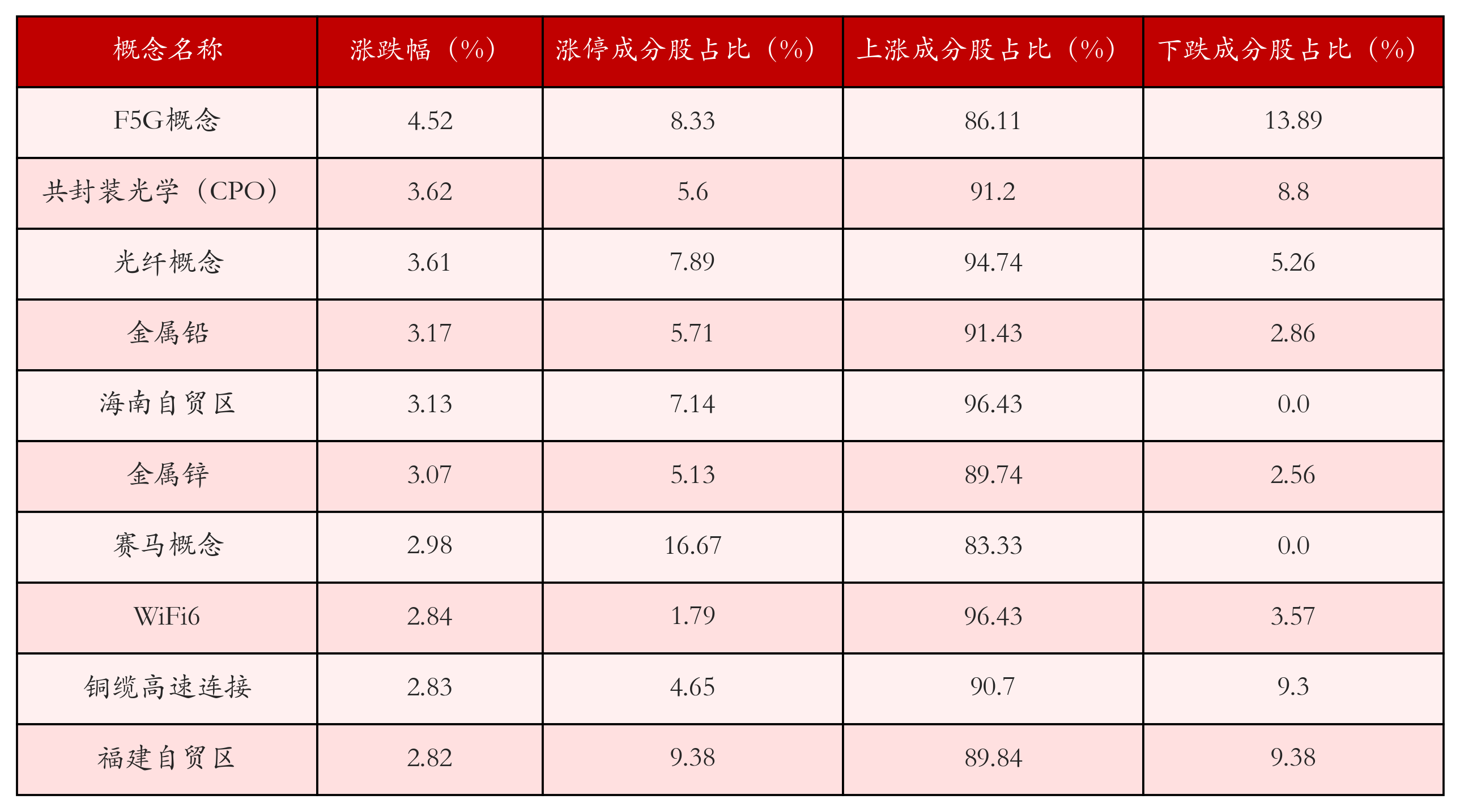 根据A股概念涨跌幅与所对应的股票池综合分析,涨幅靠前的三个概念板块分别为:F5G概念、共封装光学(CPO)与光纤概念。排名前10位的概念板块相关数据见下表: