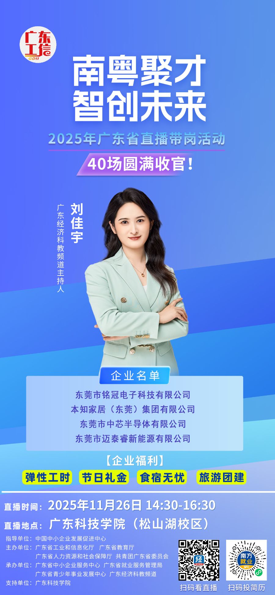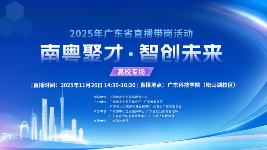 2025年广东省直播带岗活动将在2025年7月-12月开展40场线上招聘会。本次活动由中国中小企业发展促进中心指导,广东省工业和信息化厅、广东省教育厅、广东省人力资源和社会保障厅、共青团广东省委员会联合主办,广东省中小企业服务中心、广东省就业服务管理局、广东省青少年事业发展中心、广东经济科教频道共同承办。