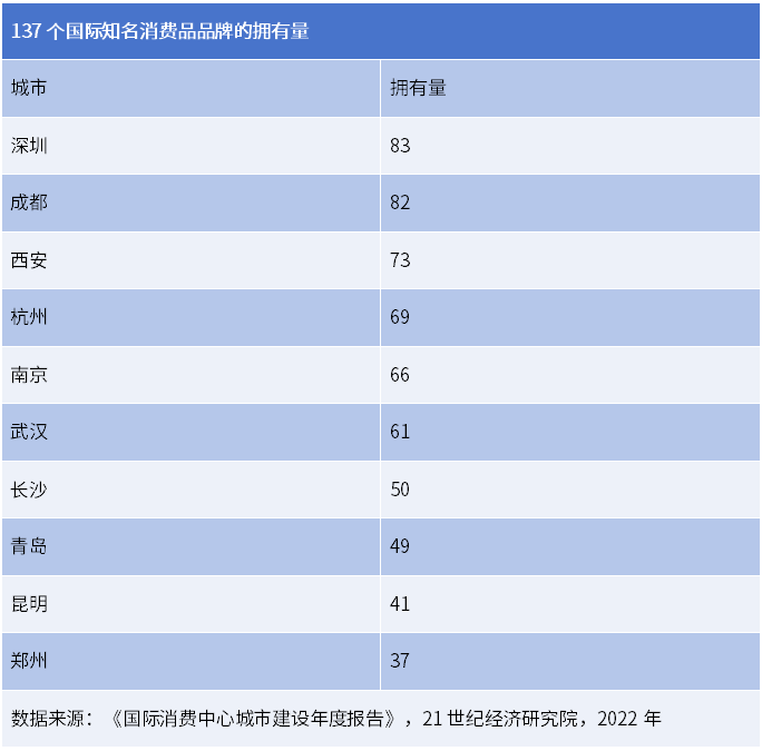 国际知名消费品品牌的拥有量,则可反映一座城市对于消费品牌的吸引能力,其中又和一座城市高能级商场或相关载体,以及消费品牌吸引政策(首店经济发展状况)的成效有关。比如西安能够在下列榜单中排名较高,也和SKP落户西安有密切关系。