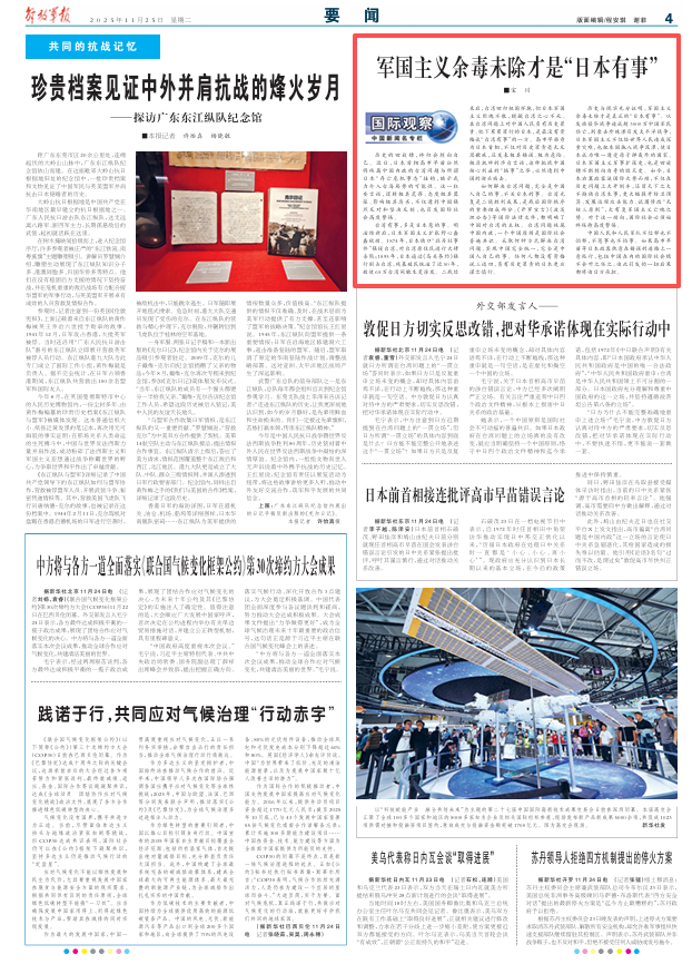 历史与现实充分证明,军国主义余毒未除才是真正的“日本有事”。从发动侵华战争造成超3500万中国军民伤亡,到袭击珍珠港引发太平洋战争,日本军国主义不仅给世界人民造成深重灾难,也把本国拖入战争泥潭,使日本成为唯一遭受原子弹轰炸的国家。日本军国主义军事扩张史,也是回旋镖不断刺向自身的毁灭史。如今,日本右翼政客逆国际大势而动,不仅在历史问题上大开倒车,还冒天下之大不韪借台湾生事,更大幅提升防卫预算、发展远程攻击能力、试图修改“无核三原则”,大有复军国主义亡魂之势。对于这一动向,国际社会必须始终保持高度警惕。