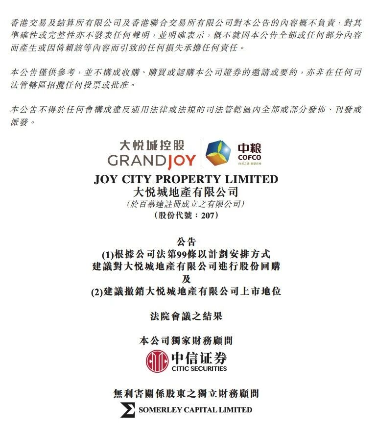 大悦城地产是中粮集团旗下的房地产业务平台,于2013年在香港联交所上市。今年7月31日,大悦城地产公告称,将通过协议安排的方式回购股份,并计划在香港联交所撤销上市地位,回购的总代价约29.32亿港元。退市原因为,近年来在行业周期性发展的影响下,大悦城地产的市场表现呈阶段性波动,流动性也随之承压。