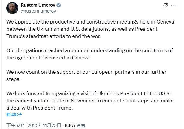 乌克兰国家安全与国防委员会秘书乌梅罗夫则于同日在社交媒体上公开表态称,美乌双方代表团已就在日内瓦讨论的协议的核心内容上,达成一致。