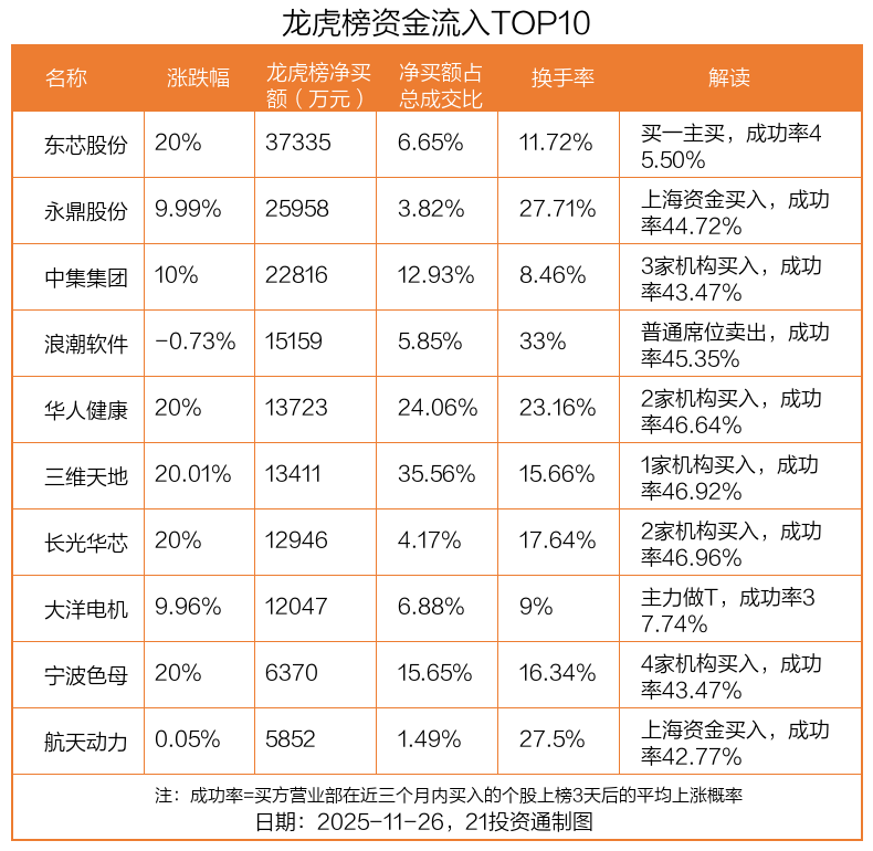 11月26日,上证指数下跌0.15%,深证成指上涨1.02%,创业板指上涨2.14%。盘后龙虎榜数据显示,共有55只个股因当日异动登上龙虎榜,资金净流入最多的是东芯股份(688110.SH),达3.73亿元。